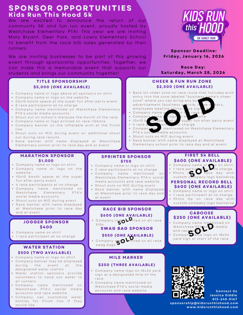 2026 Sponsors are rolling in! See below for the amazing sponsors who have already committed to sponsor Kids Run this ‘Hood 5k and Fun Run featuring FOUR neighboring community schools OR click the link below to become a sponsor!!!